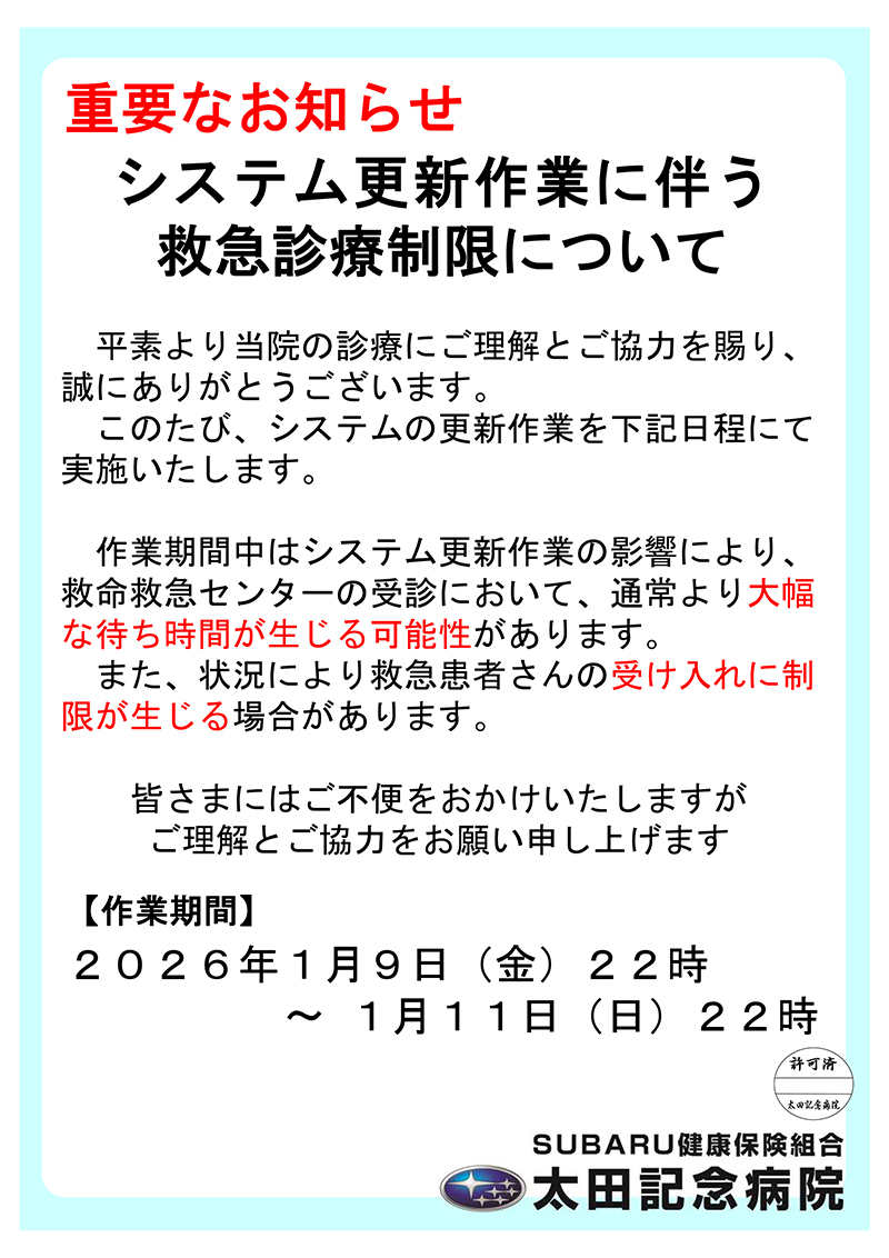 作業期間中はシステム更新作業の影響により、救命救急センターの受診において、通常より大幅な待ち時間が生じる可能性があります。 また、状況により救急患者さんの受け入れに制限が生じる場合があります。